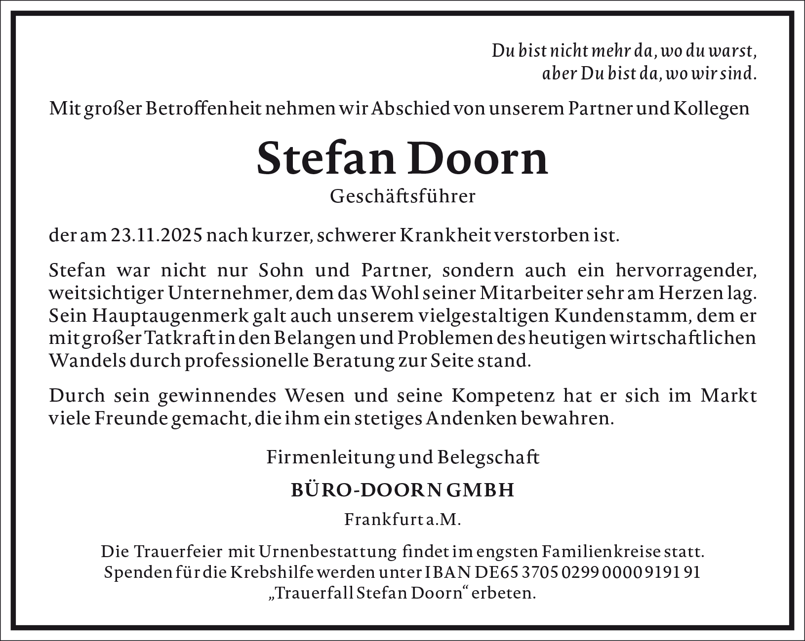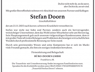 Für den Bürofachhandel im Rhein-Main-Gebiet, für die Büroring Gemeinschaft und für viele Wegbegleiter bleibt Stefan Doorn als engagierter Branchenunternehmer in Erinnerung, der seinen Beruf ernstgenommen und seine Rolle im Netzwerk aktiv ausgefüllt hat. Sein Tod hinterlässt eine spürbare Lücke in einem Markt, der Persönlichkeiten braucht, die Verantwortung übernehmen und sich über das eigene Haus hinaus einbringen.