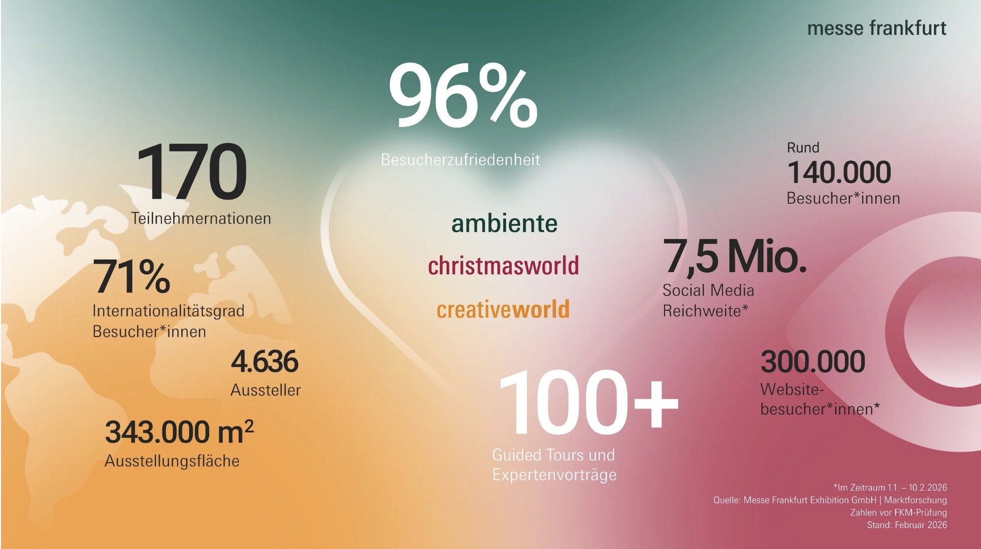 Mit hoher Internationalität, starker Besucherzufriedenheit und klaren inhaltlichen Impulsen haben Ambiente, Christmasworld und Creativeworld ihre Rolle als zentrale Leitmessen der Konsumgüterbranche bestätigt. Vom 6. bis 10. Februar 2026 kamen rund 140.000 Besucher aus aller Welt nach Frankfurt.