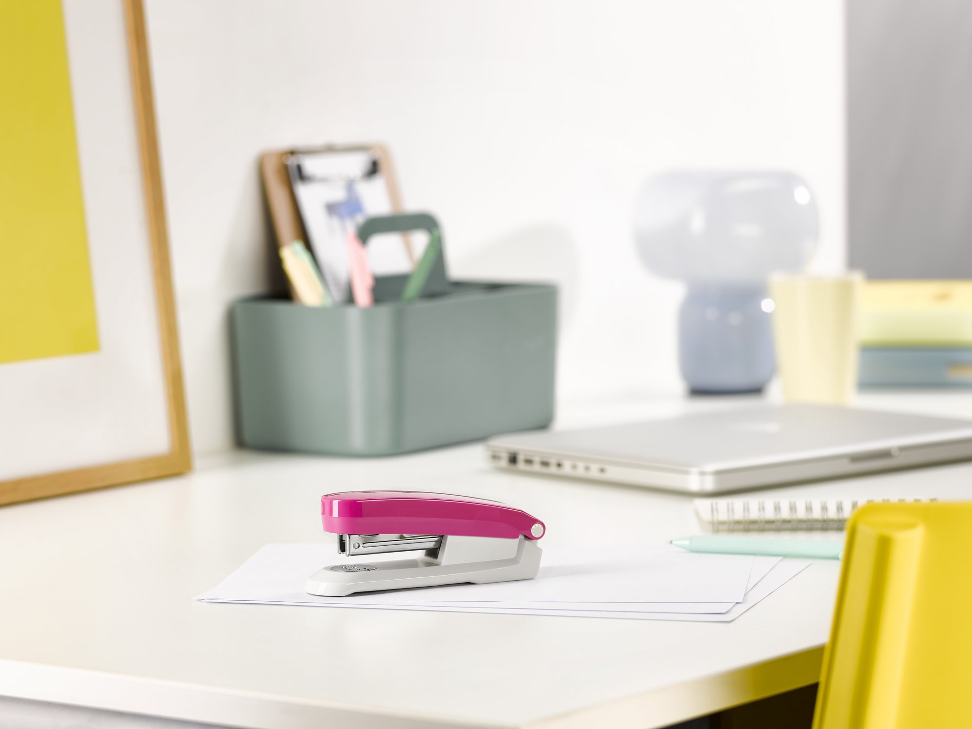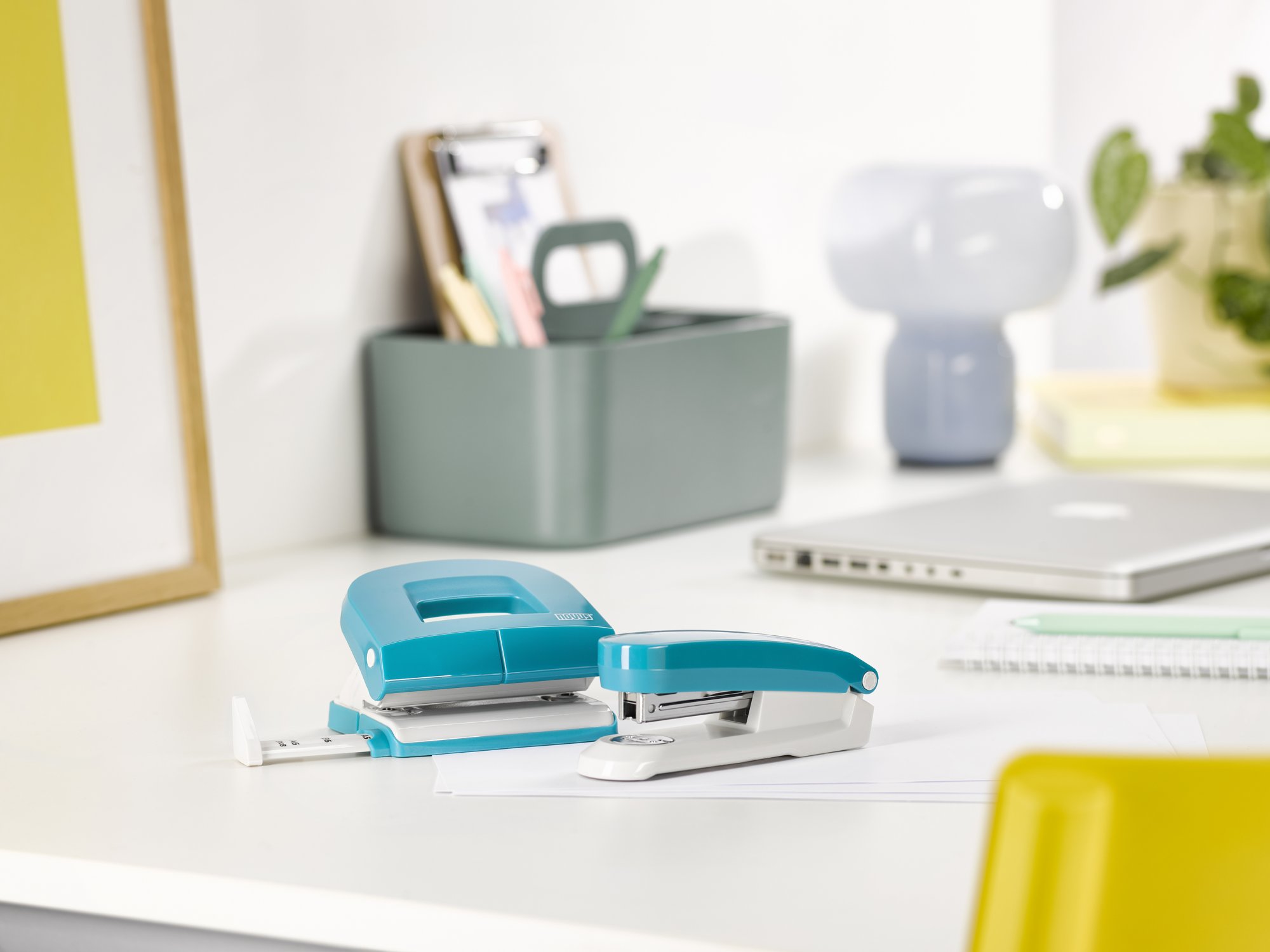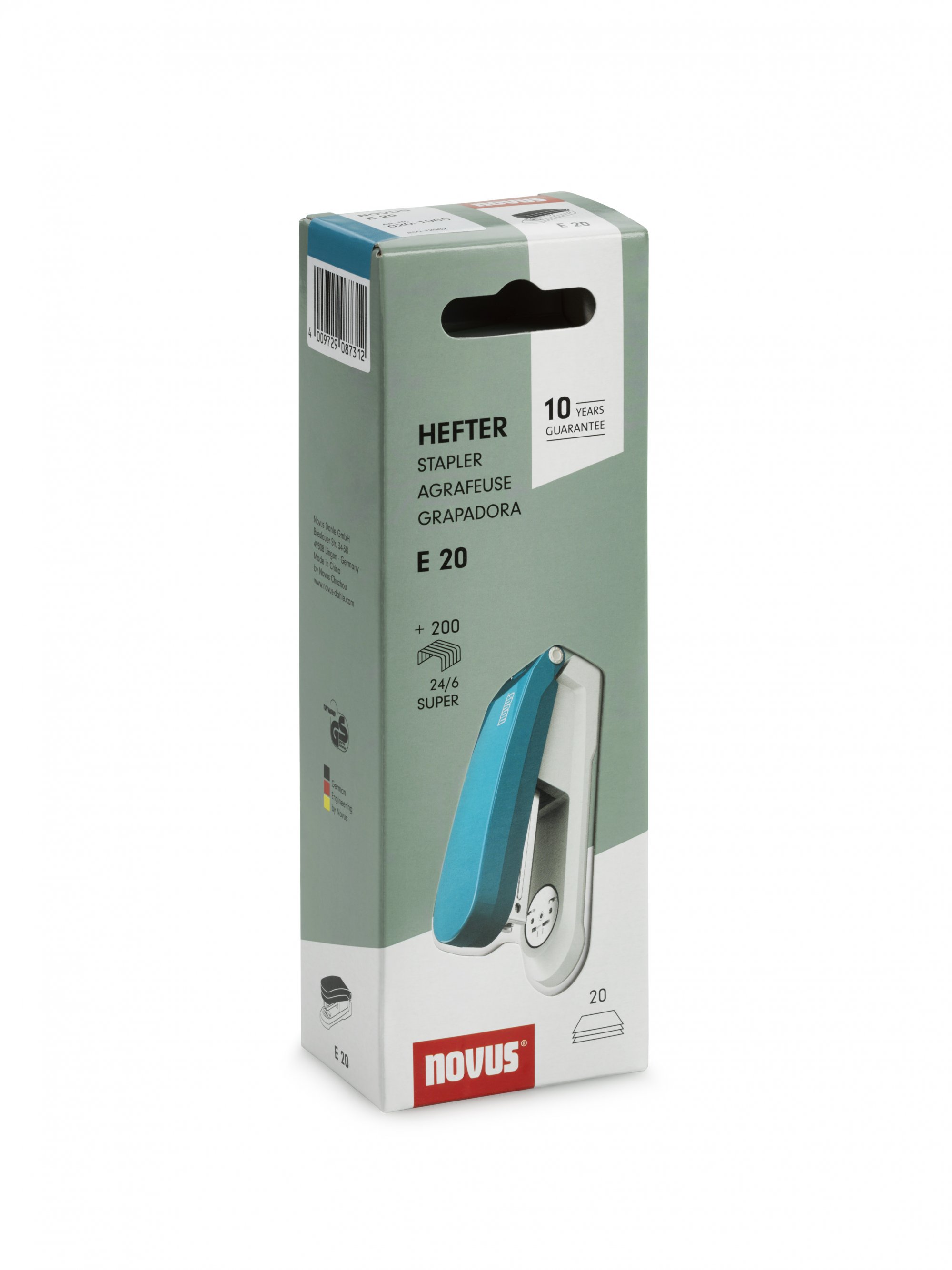 Parallel zum Packaging wurde die Serie selbst neu geordnet. Einzelne Farben und Produkte entfallen, neue Varianten kommen hinzu. Zurück im Sortiment ist das Heftgerät Novus E 20 mit integriertem Klammerentferner und einer Heftleistung von bis zu 20 Blatt. Insgesamt umfasst die Reihe nun vier Einzelprodukte mit zwei Heftgeräten und zwei Lochern sowie ein Set aus Heftgerät und Locher. Angeboten werden alle Varianten in sechs Farben, von klassischen Tönen wie Blau, Schwarz und Rot bis zu aufmerksamkeitsstarken Varianten in Pink, Petrol und Grün. Die hellgrauen Unterteile sorgen für ein einheitliches Erscheinungsbild.