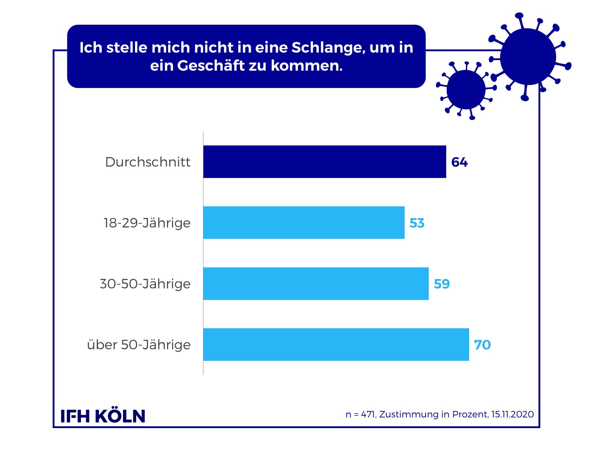 Einlasskontrollen und -beschränkungen im stationären Einzelhandel stoßen bei vielen Konsument*innen auf Ablehnung. So geben 64 Prozent an, nicht bereit zu sein, sich in eine Schlange vor ein Geschäft zu stellen. Die Bereitschaft, vor dem Ladengeschäft auf Einlass zu warten, ist dabei bei jüngeren Befragten zwischen 18 und 29 Jahren höher. Die Altersgruppe der über 50-Jährigen lehnt Wartezeiten vor Geschäften zu 70 Prozent ab.