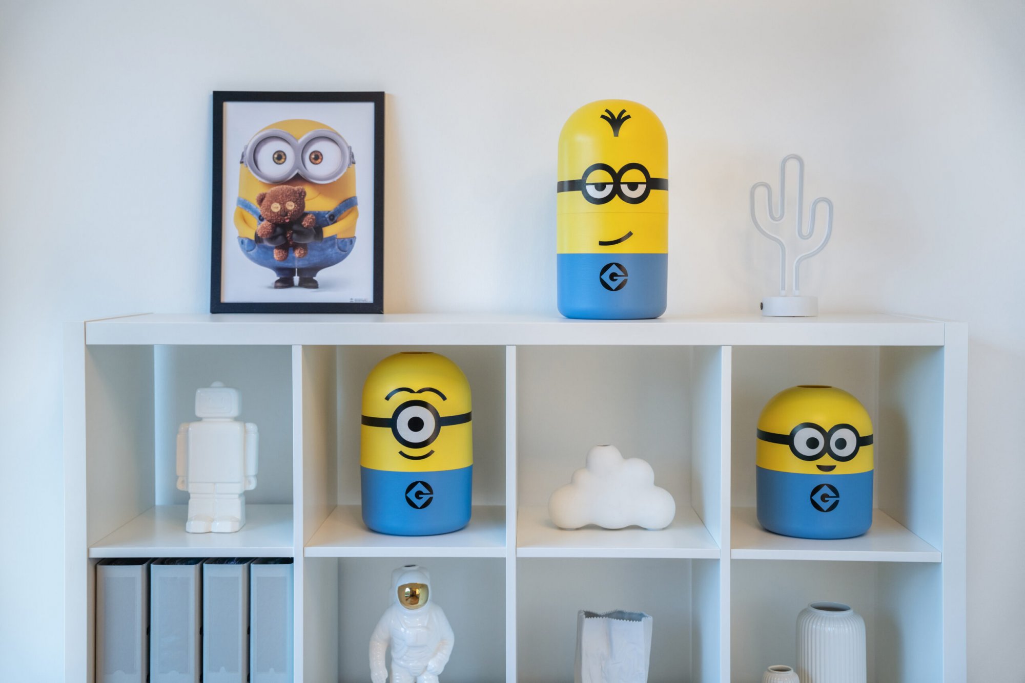 Die neuen Aufbewahrungslösungen mit den Figuren bob, stuart und kevin richten sich besonders an Familien und Kinderzimmer. Sie sollen mit spielerischem Design Ordnung ins Zuhause bringen und zugleich als Blickfang fungieren. Die detailgetreuen Motive und das humorvolle 360-Grad-Design schaffen eine positive und spielerische Atmosphäre.